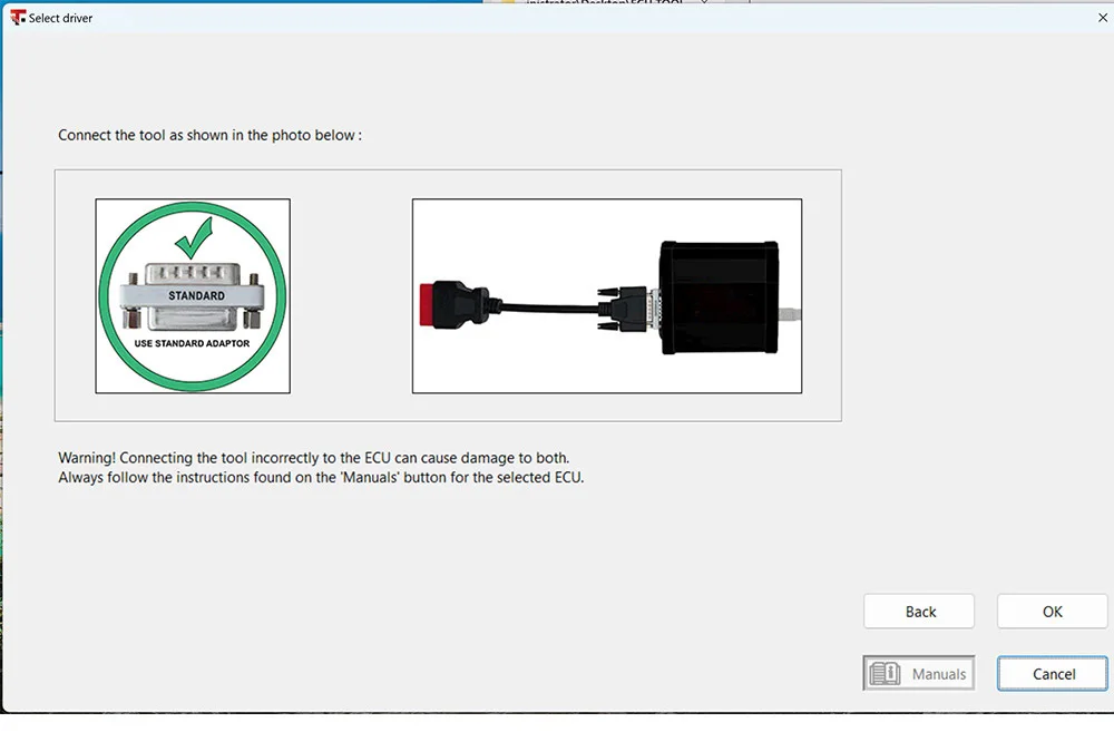 Select "driver", then "Next", then it will pop up this message telling to connect gender adapter to the OBDII cable.